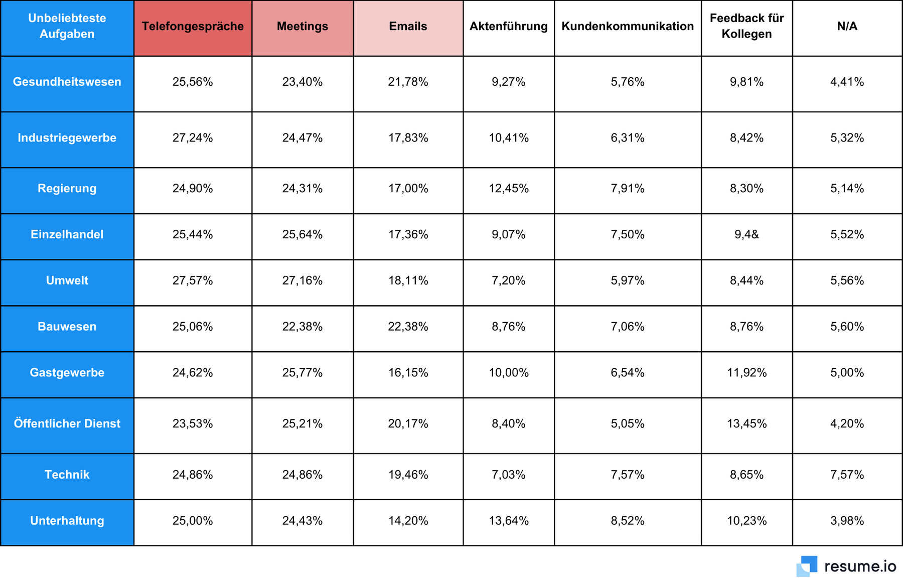 Die Umfrage von Lebenslaufapp ergab, dass die Aufgabe, die Arbeitnehmer*innen am lästigsten finden, telefonieren ist. Erstaunlicherweise hat ein Viertel der Befragten aus den unterschiedlichsten Branchen diese Tätigkeit als ihre unbeliebteste Aufgabe bezeichnet. Bemerkenswert ist, dass der Umweltsektor diese Tätigkeit am häufigsten als ihre unbeliebteste wählte: 27,57 % der Befragten in der Branche gaben Telefonieren an, dicht gefolgt von der Fertigungsindustrie (27,24 %). Interessanterweise sticht der öffentliche Dienst mit dem niedrigsten Prozentsatz an Mitarbeiter*innen als einer der Ausreißer hervor, was die Ablehnung gegenüber dem Telefonieren anging. Überraschenderweise erwiesen sich Meetings als die Hauptquelle der Unzufriedenheit in dieser Branche. Könnte das an Videokonferenzplattformen wie Zoom liegen, also daran, dass wir nicht wie früher gemeinsam im Büro sein müssen, um zu kommunizieren?